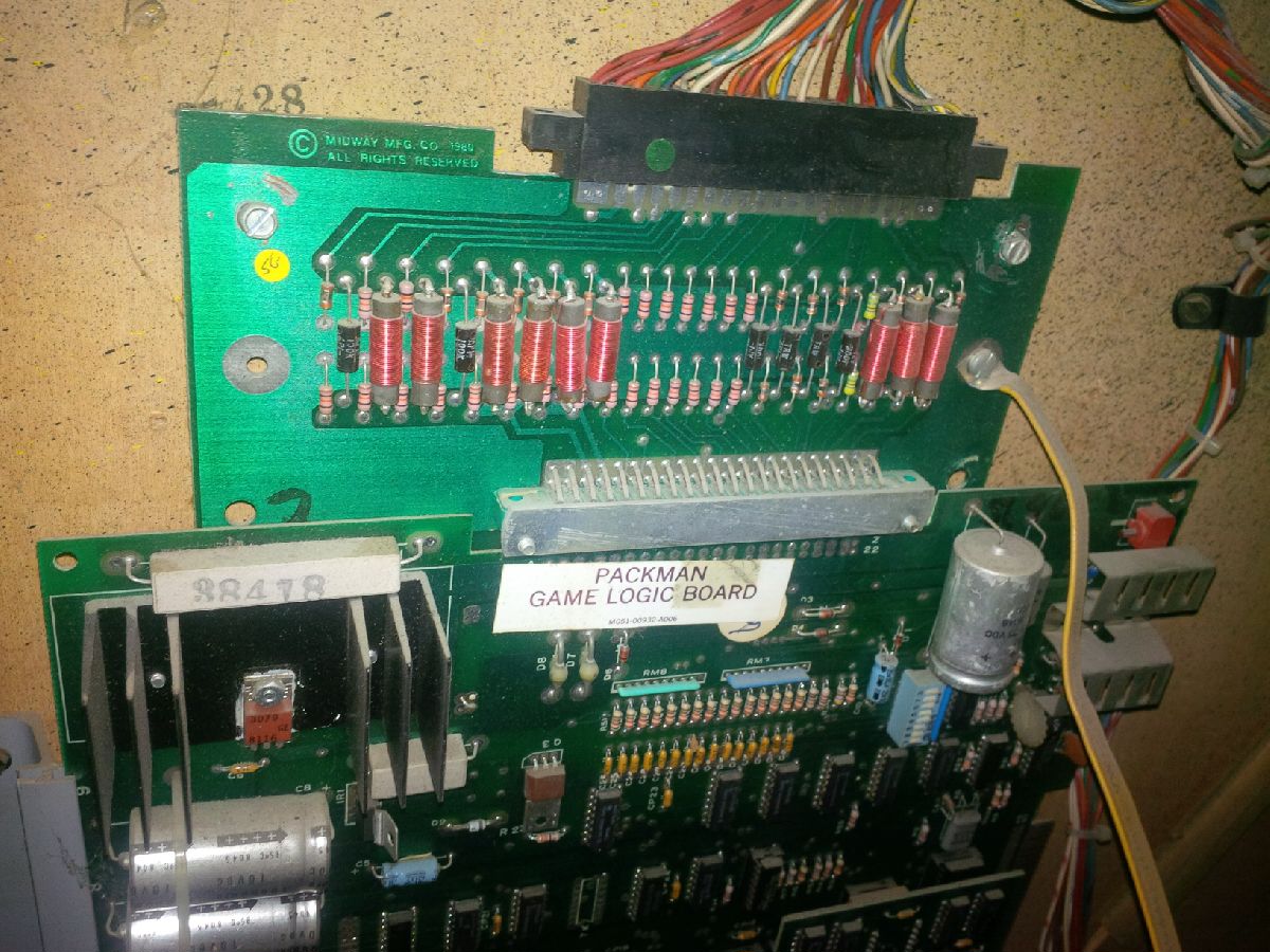 Of course, it does seem like the Pac Man board itself is having some issues. You might look at that arcadegameover.com Pac Man Troubleshooting page and compare the screen you got (when you plugged the Pac Man board into the Ms. Pac Man cabinet) to the pictures to see if you can find something similar. If you can’t, it might be better to send the board off for repair to one of the people we recommend on our resources page or invest in the ABC Diagnostics Kit from TwoBits.com.