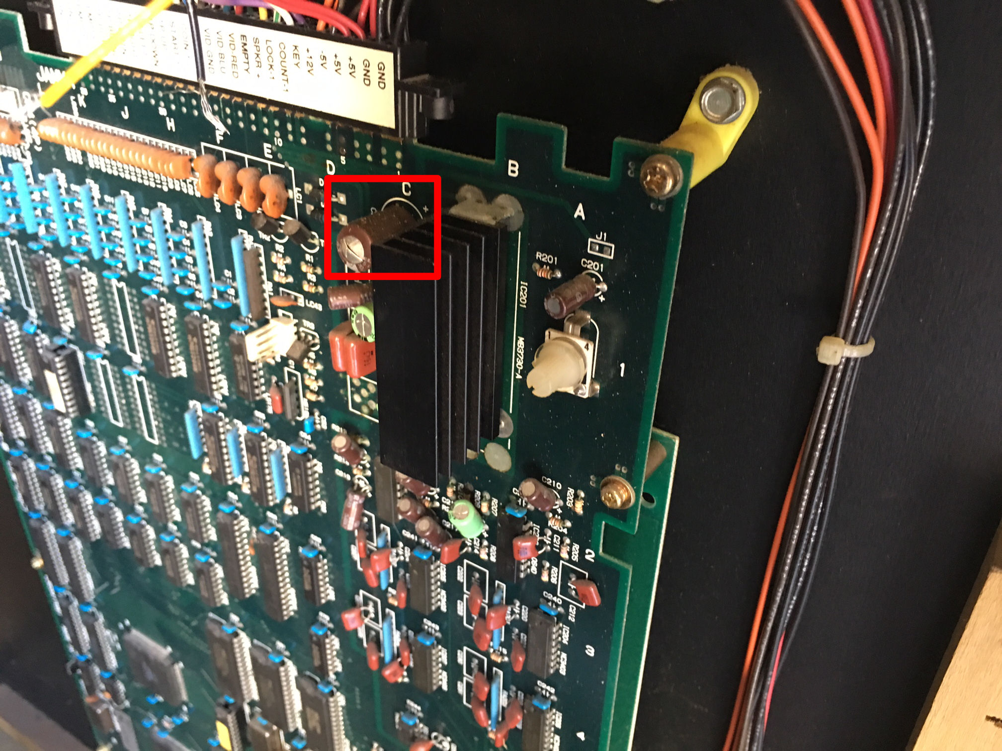 Let’s start by referring you to our post on Troubleshooting Games With Sound Issues as it has a lot of great information on your problem. With that said, I am looking at your pictures and noticed that at least one cap in the audio section of your Skins Game board is bad. I have attached the picture and put a red box around the offending cap. If there is one cap bad, there could be other parts in this area of the board that are not working properly. Highly recommend checking out all of the parts in this area of the board to make sure they are good. A good rule of thumb is to follow the trace on the board that goes to that cap and see if there are any other parts on the line that are damaged or not working. Of course, please let us know if you have any additional questions once you have tried the troubleshooting techniques we have discussed in this email and we’ll try to help you out further.